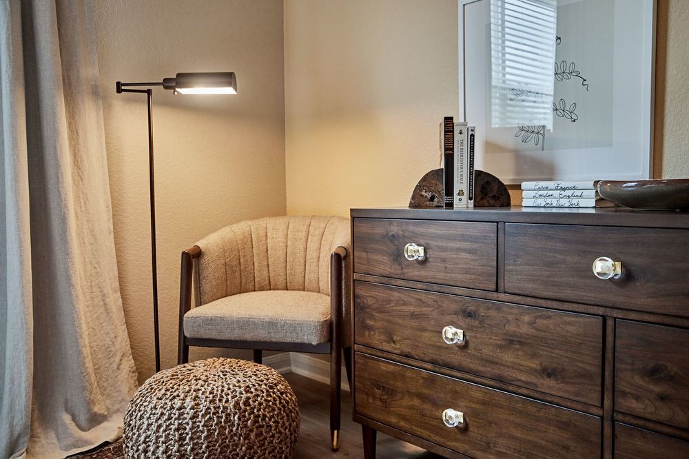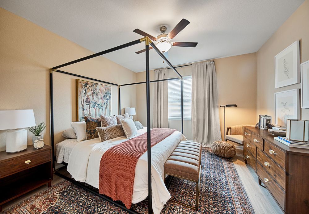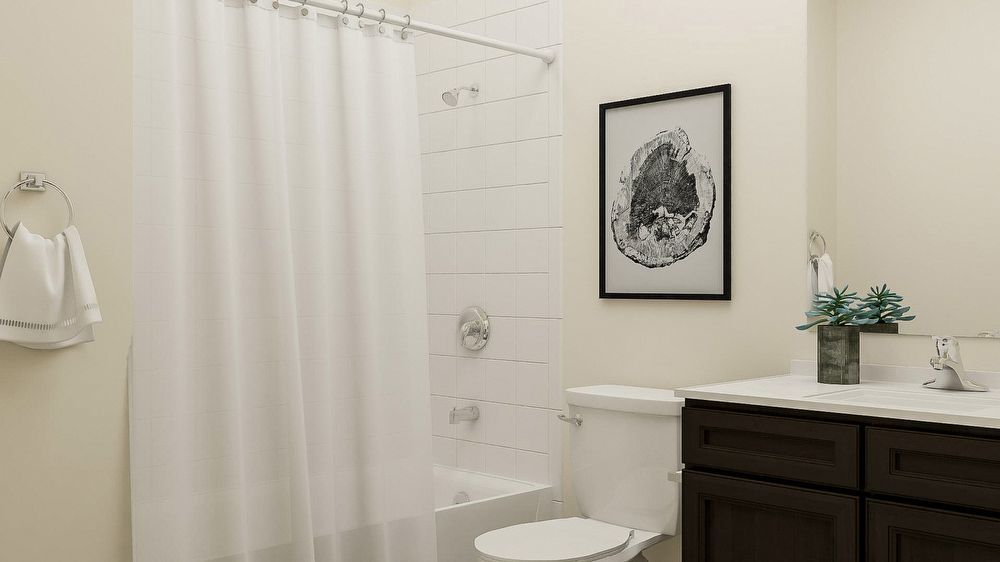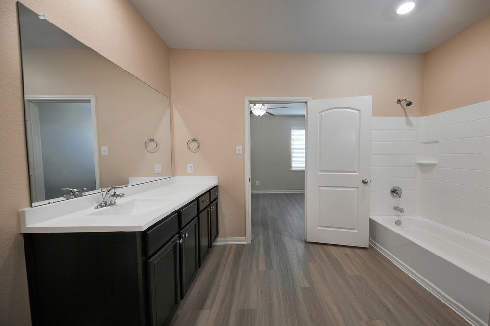 The master retreat of the Archer has two large windows with views of the private, fully fenced, back yard. The attached bath is equipped with a large countertop, dual shower and bathtub, and a large walk-in-closet for all your storage needs.