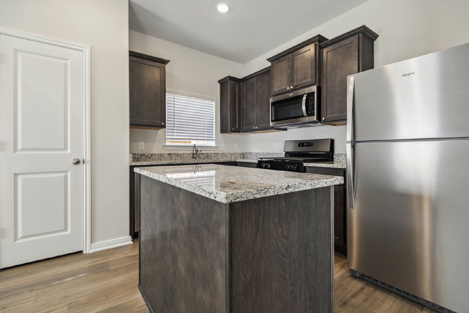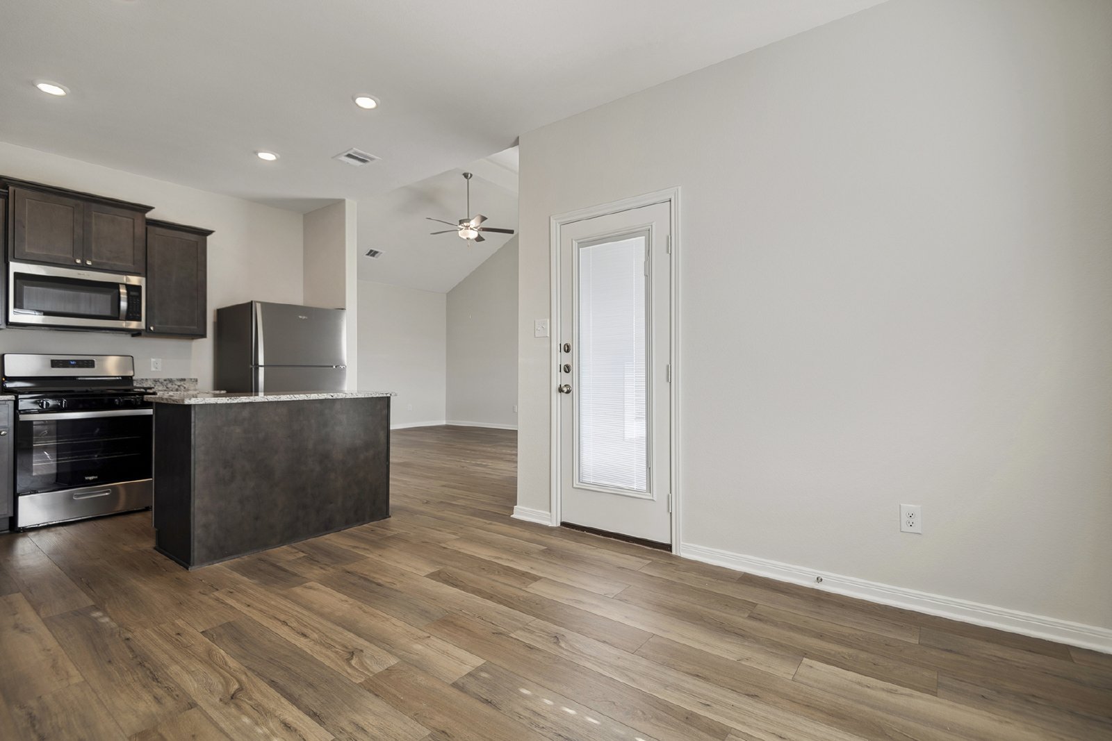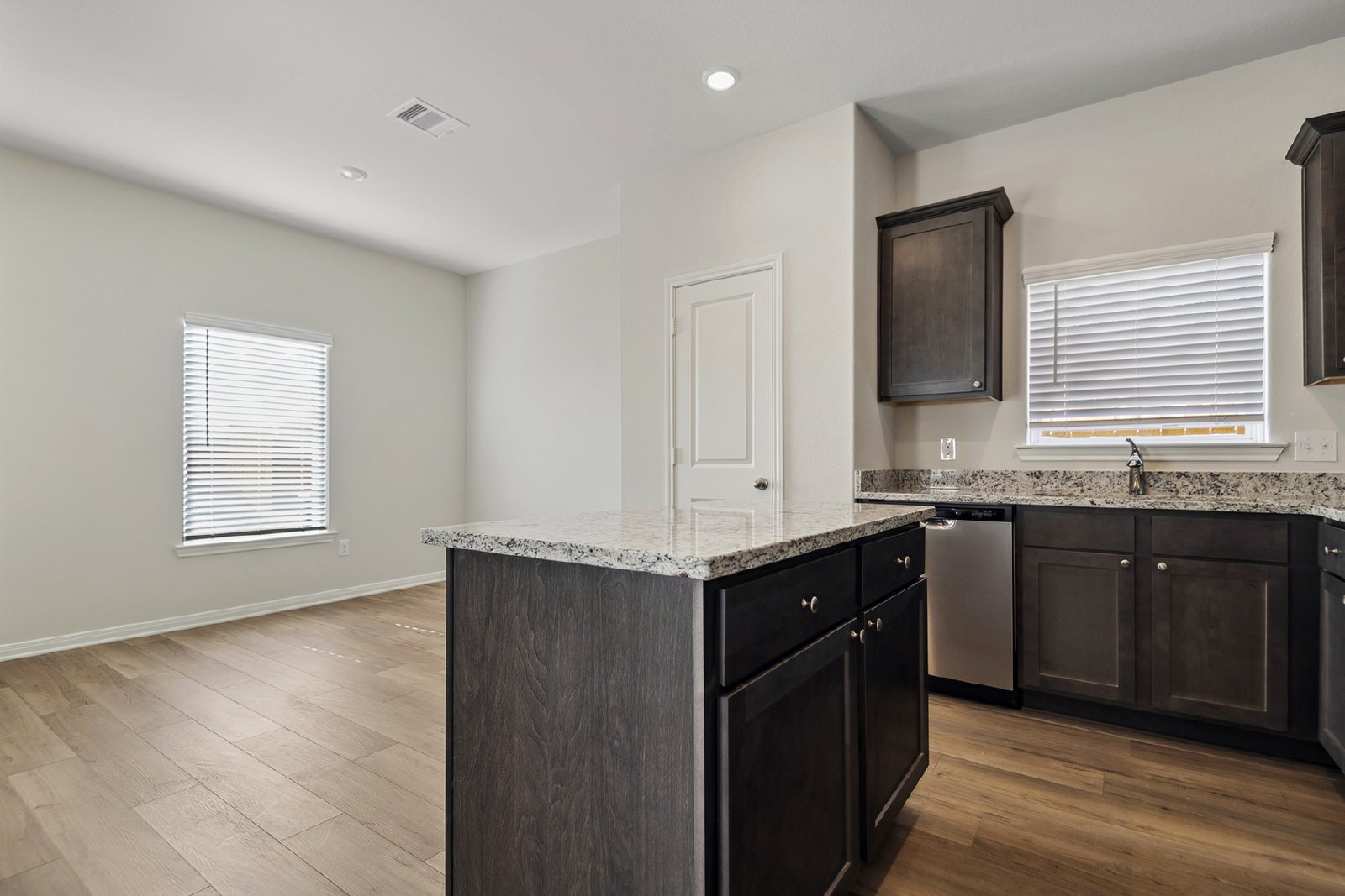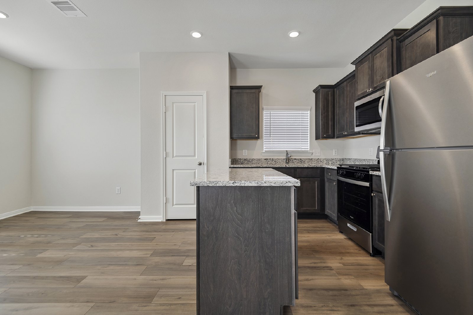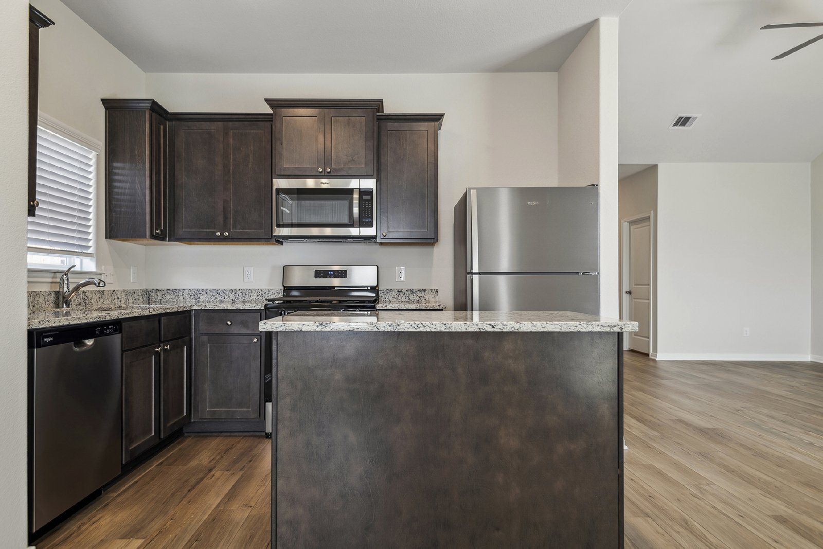 The Robin floor plan at Freeman Ranch is available for lease, offering a spacious 1,658 sq. ft. single-story layout that includes three bedrooms, a versatile flex room and an open-concept living area. This home is designed to accommodate both everyday living and entertaining with ease. The chef-ready kitchen is the heart of the home, featuring granite countertops, stainless steel appliances, and a large island ideal for everyday functionality or casual gatherings. The adjoining dining area leads to a covered back patio, making it an ideal space for outdoor dining and relaxation. A large window in the family room overlooks the private back yard, filling the home with natural light.