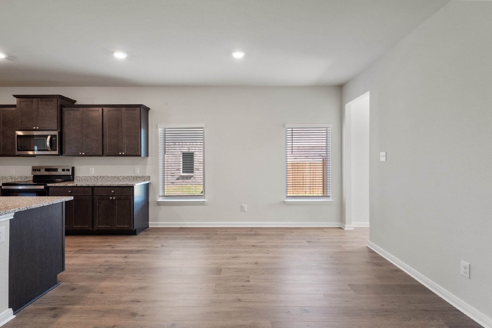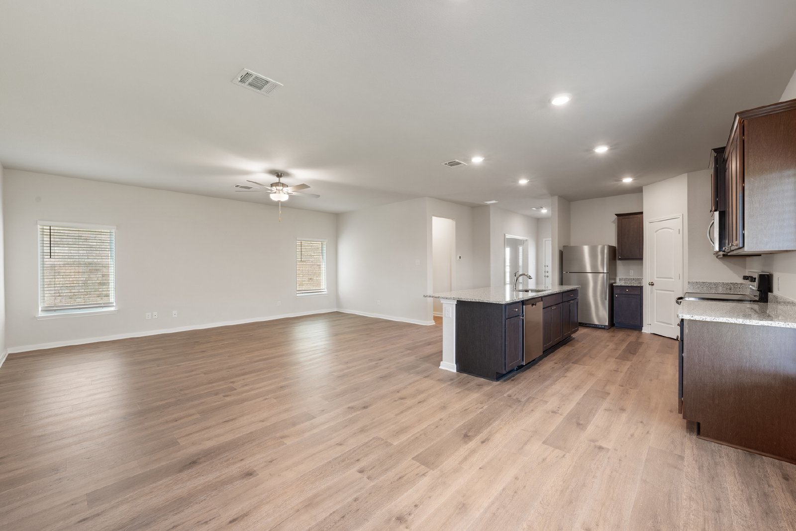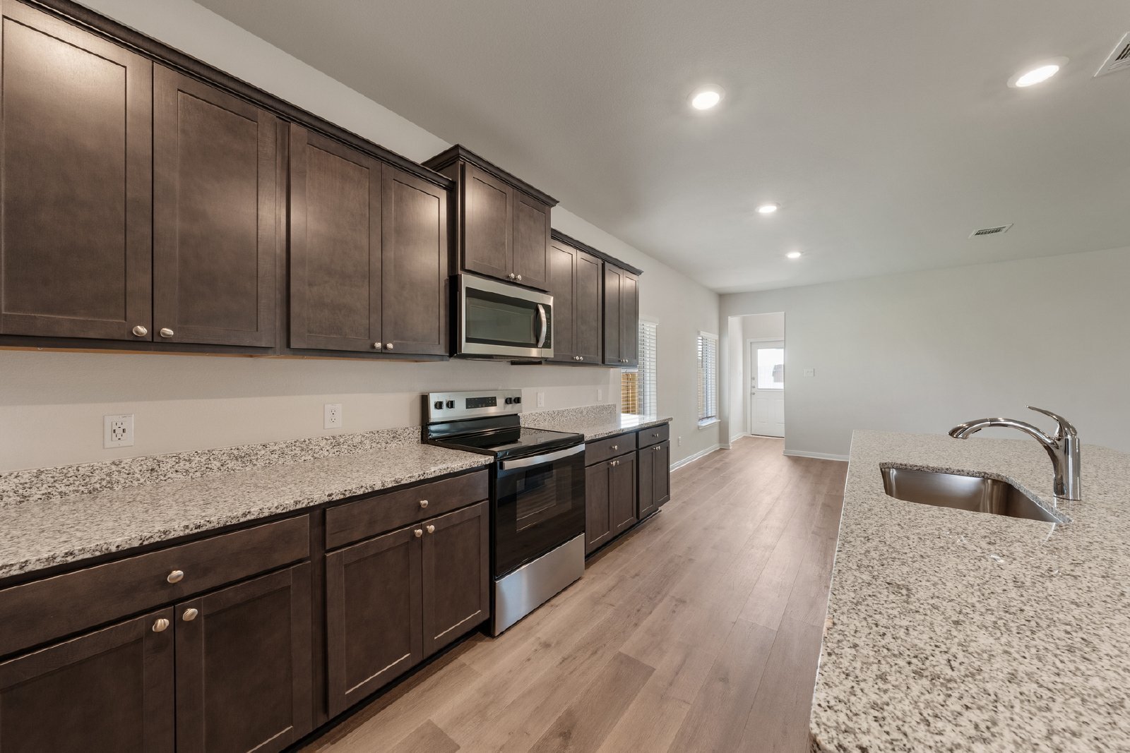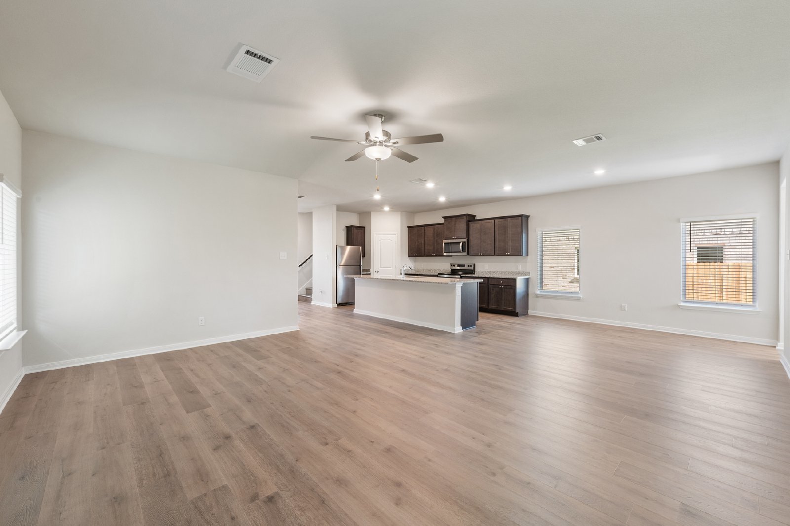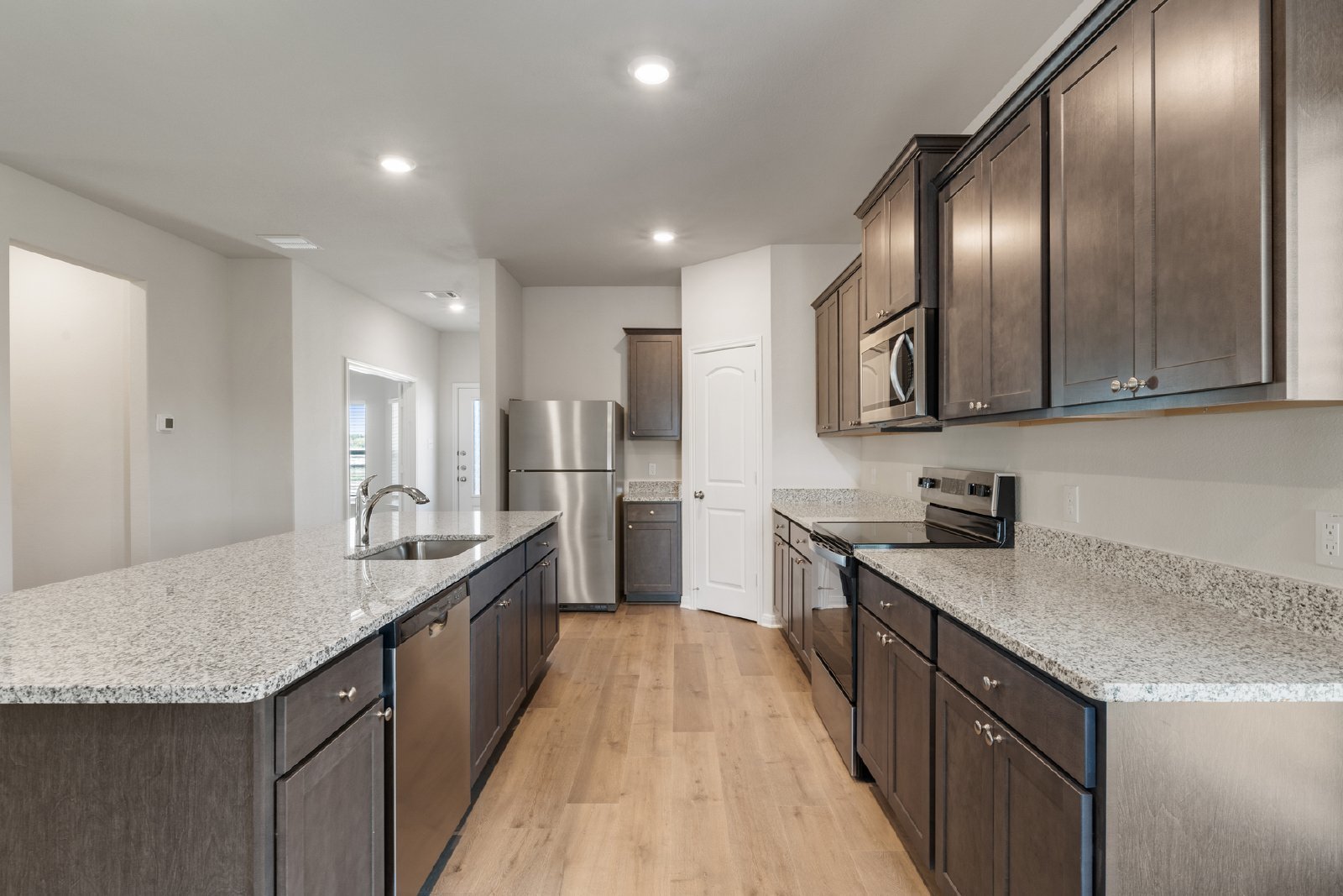 The Bluebonnet floor plan at Southaven by LGI Living is now available for lease, offering an expansive 2,207 sq. ft. two-story design with four bedrooms and two-and-a-half bathrooms. This versatile floor plan is perfect for modern living, featuring an open-concept layout that connects the kitchen, dining, and family room, making it ideal for entertaining or family gatherings. The kitchen is equipped with a large center island, sleek granite countertops, wood cabinetry, and energy-efficient stainless steel appliances, ensuring both style and practicality.